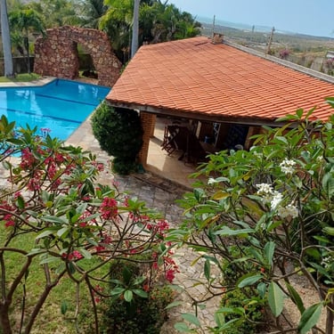 Área externa completa: Piscina com cascata, deck com churrasqueira, jardim e paisagismo